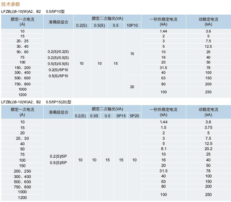 二、LFZBJ8-10A2、LFZB8-10B2穿墻式電流互感器技術(shù)參數(shù)